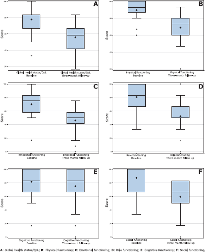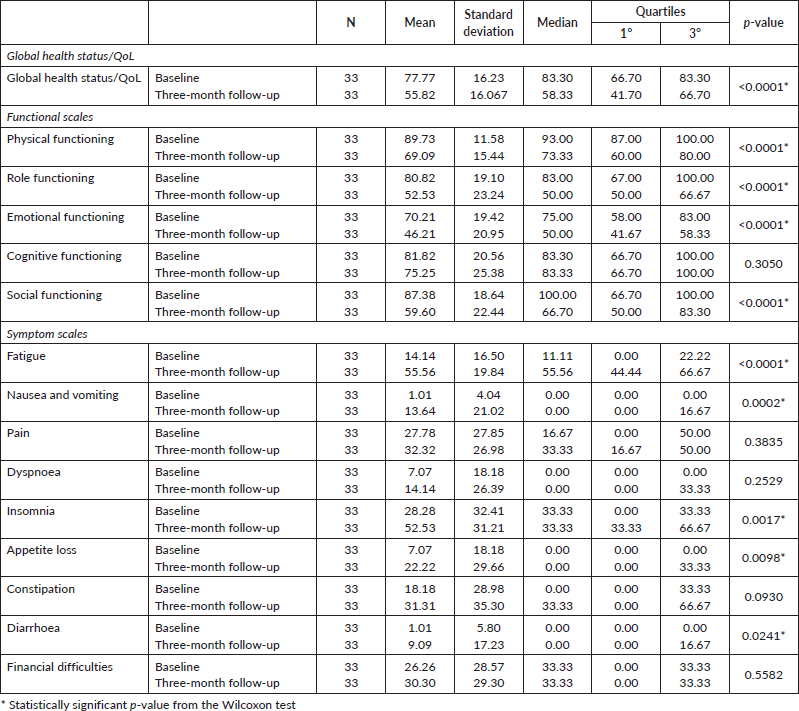 We evaluated the questionnaire according to standardised methodology recommended by the EORTC Group. Data analysis was performed using SAS version 9.4. The sociodemographic and clinical-epidemiological results were described by means, standard deviation, median, minimum, maximum, first quartile (1° Q) and third quartile (3° Q) or using of absolute and relative frequencies. To analyse the paired data in the two follow-up times, the Wilcoxon test was used, considering statistically significant those results whose p-value (p) was ≤ 0.05. There were no adjustments for multiplicity.