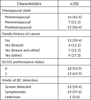 Results concerning sociodemographic and clinical characteristics from the 33 patients included in the study are described in Tables 1 and 2. The patients had a median age of 51.4 years and were mostly married (75.8%), almost half of them studied until elementary or middle school (48.5%), the majority were non-smokers (72.7%) and non-alcoholic (81.8%). Regarding patients’ clinical characteristics, almost half of them were premenopausal in diagnosis (42.4%), and most of them had a family history of cancer (60.6%).