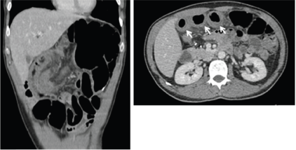 Figure 1. CT scan showing bowel thickening and dilation. Arrow shows small bowel thickening.