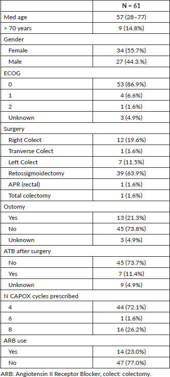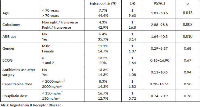 Conclusion: Our data showed that adjuvant CAPOX induced severe enterocolitis in 13.1% of patients. In addition, we found that advanced age, right colectomy and concurrent use of ARB were statistically associated with these events. Awareness of these factors could be easily incorporated into the treatment decision and patient orientation.