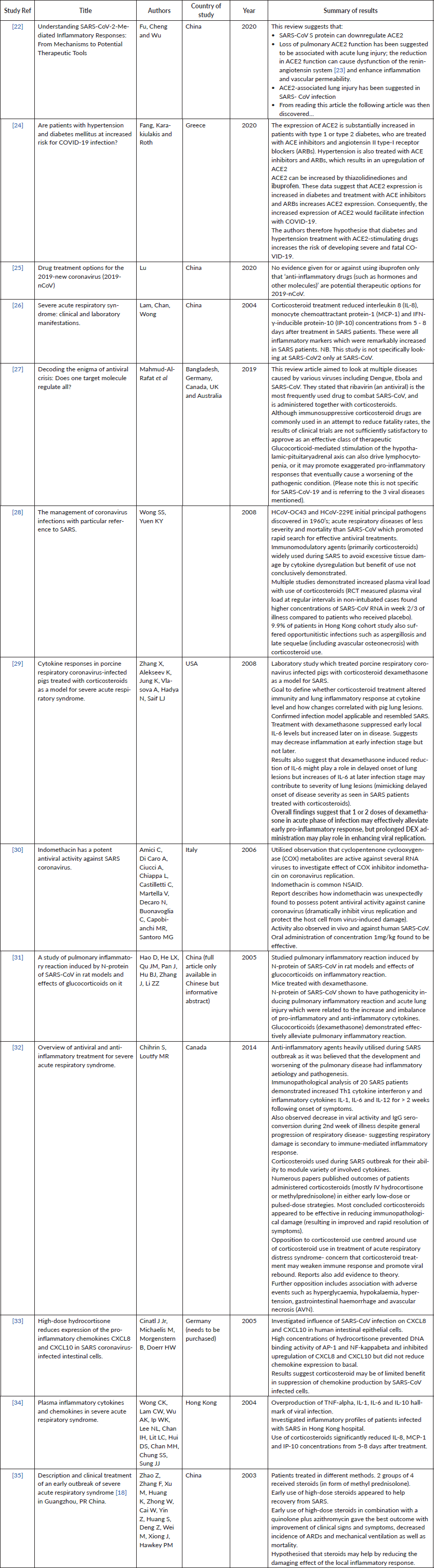 A total of 58 studies were identified from the search terms, of which 13 were deemed suitable for inclusion (Supplementary Table 2). Our search did not identify any strong evidence for or against the use of ibuprofen for treatment of COVID-19 specifically. One study did however link SARS-CoV to the downregulation of angiotensin converting enzyme-2 (ACE2) which is upregulated by ibuprofen [12]. The authors of this study were investigating the link between the severity of COVID-19 symptoms in patients with asthma and hypertension.