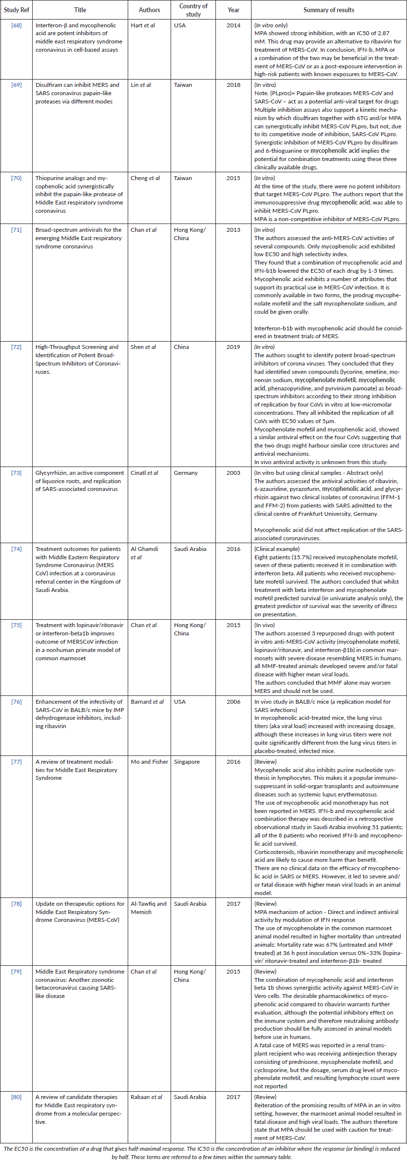 68. Hart BJ, Dyall J, and Postnikova E, et al (2014) Interferon-beta and mycophenolic acid are potent inhibitors of Middle East respiratory syndrome coronavirus in cell-based assays J Gen Virol 95(Pt 3) 571–577 https://doi.org/10.1099/vir.0.061911-0 PMCID: 3929173