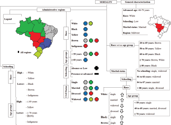 The highest number of deaths from uterine cancer was observed in women with the following characteristics: aged 60 to 79 years (59.02%), belonging to the White race (61.44%), with low education ≤3 (31.58%), married (34.84%) or widowed (33.54%) and reside in the Midwest (56.33%) of Brazil. The results are shown in Figure 1.