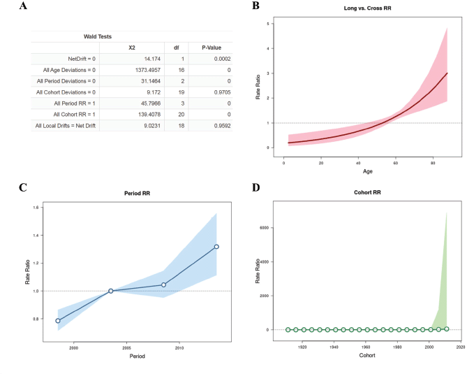 Figure 2. APC analysis with Wald test (A), all age deviations (B), period rate ratios (RR) (C) and cohort (RR) (D) .