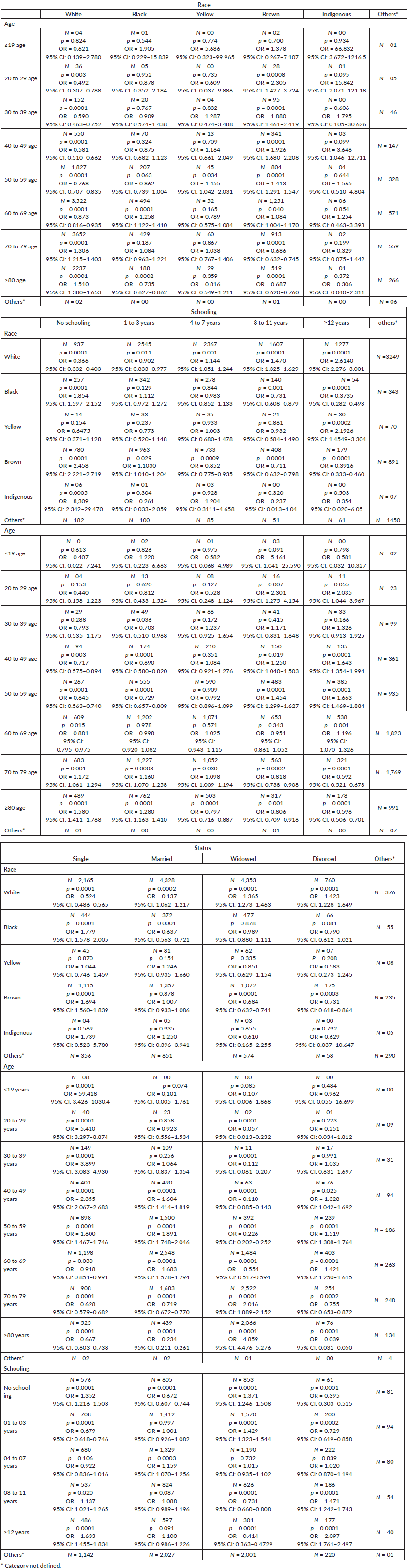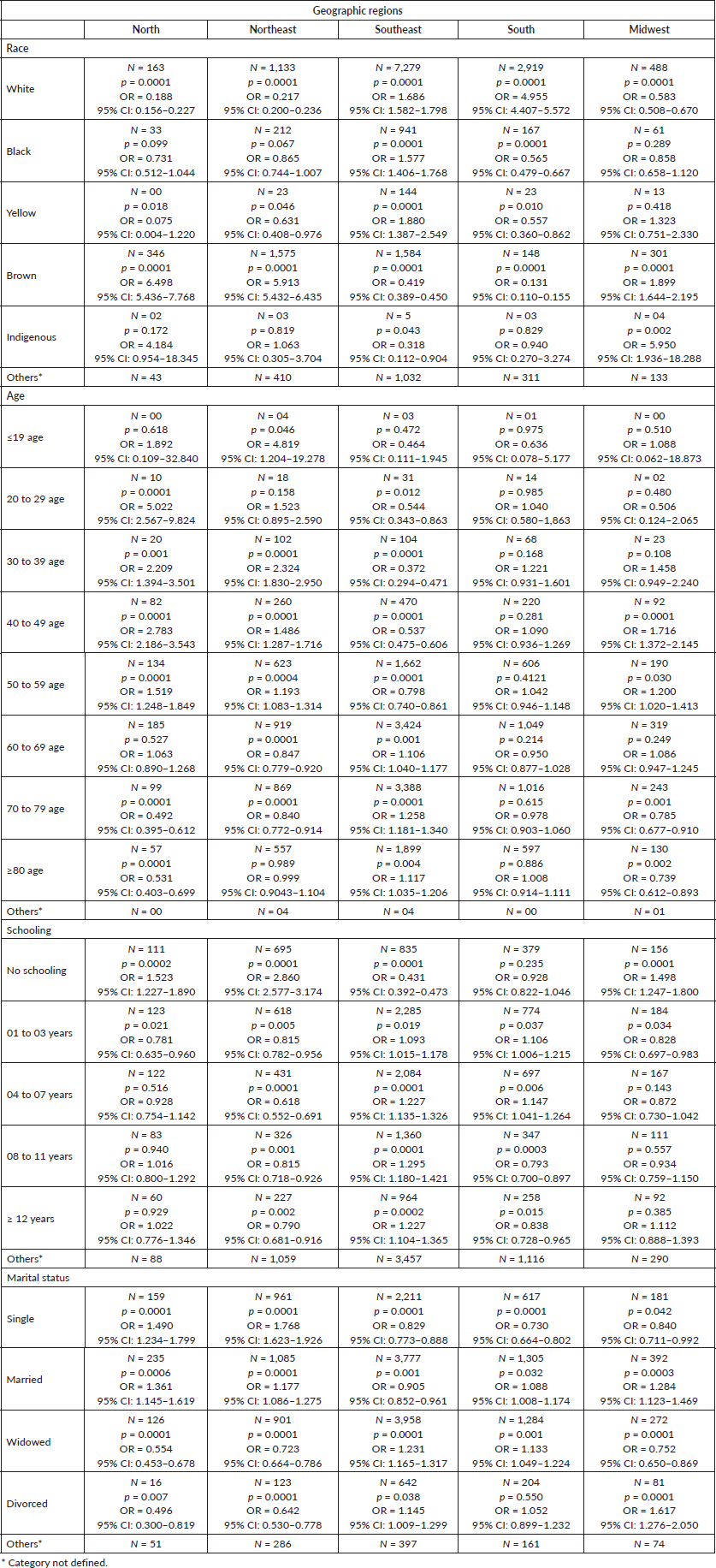 Geographic regions, age, marital status, race/ethnicity and educational attainment were considered the sociodemographic factors. These factors were further categorised as follows: geographic regions (North, Northeast, Midwest, South and Southeast), race/ethnicity (Brown, White, Black, Yellow and Indigenous), age (less than 19, 20–29, 30–39, 40–49, 50–59, 60–69, 70–79 and greater than 80 years), marital status (single, married, widowed and divorced) and schooling (no schooling greater than 12 years).