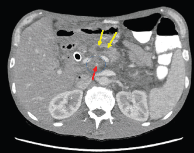 Figure 1. CT Abdomen showed 3.5 x 2.5 cm primary tumour in pancreatic head/uncinate process mass with complete encasement of superior mesenteric artery (SMA)/superior mesenteric vein (SMV). No evidence of any regional lymphadenopathy or liver metastasis. The figure illustrates the approximate extent of pancreatic mass (circled), pancreatic duct dilatation (yellow arrow) and the narrow superior mesenteric artery (red arrow).