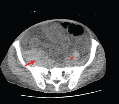 Figure 2. CT Abdomen showing severe anasarca and retroperitoneal haemorrhage. The figure shows the bilateral retroperitoneal haemorrhages both right sided (thick arrow) and left sided (thin arrow). It illustrates the asymmetry with right side retroperitoneal haemorrhage being larger in size.