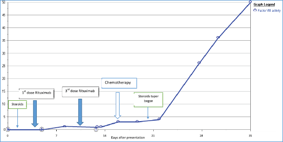 Figure 3. Increasing factor VIII level as chemotherapy was given, also shows timeline of other used immunosuppressive therapies.