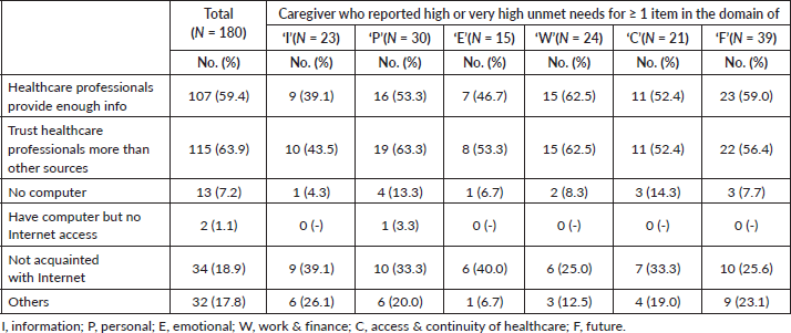 The study concludes that caregivers of cancer patients are actively involved in information search indicating a need for information while providing care and support to the cancer patient. In addition, slightly more than a quarter of information searchers who used the Internet reason for doing so was the information provided by HCPs is insufficient. This implies that either additional or more detailed information to aid in learning and to assist in fulfilling their caregiving roles is needed. Less than half of caregivers have used their preferred source when conducting their most recent information search with the greatest mismatch being found in the HCPs. Caregivers indicated preferring to receive information from HCPs than informal resources such as the Internet. They resorted to the Internet to help address their information needs; however, they were concerned with the quality of information obtained. These further re-enforce the challenges confronting the caregivers and the support needed as they seek information to provide the needed care and support to the cancer patients. As caregivers play a crucial role in providing care and support to the cancer patient, and their ability to render care and support may be compromised by their lack of knowledge and skill, thus it is critical for HCPs to recognise, respect, assess, and address their information needs. It is also important to develop standardised information based on caregivers’ identified needs and deliver the information in various health formats so that information is readily available. Moreover, information delivery must also be in the manner and through the mode that is in accordance to their preference. In addition, given the high rates of Internet information-seeking, our finding suggests that this may be an ideal platform to deliver high-quality information, interventions, and reliable health related web-links for the younger, educated, and better off socioeconomically.