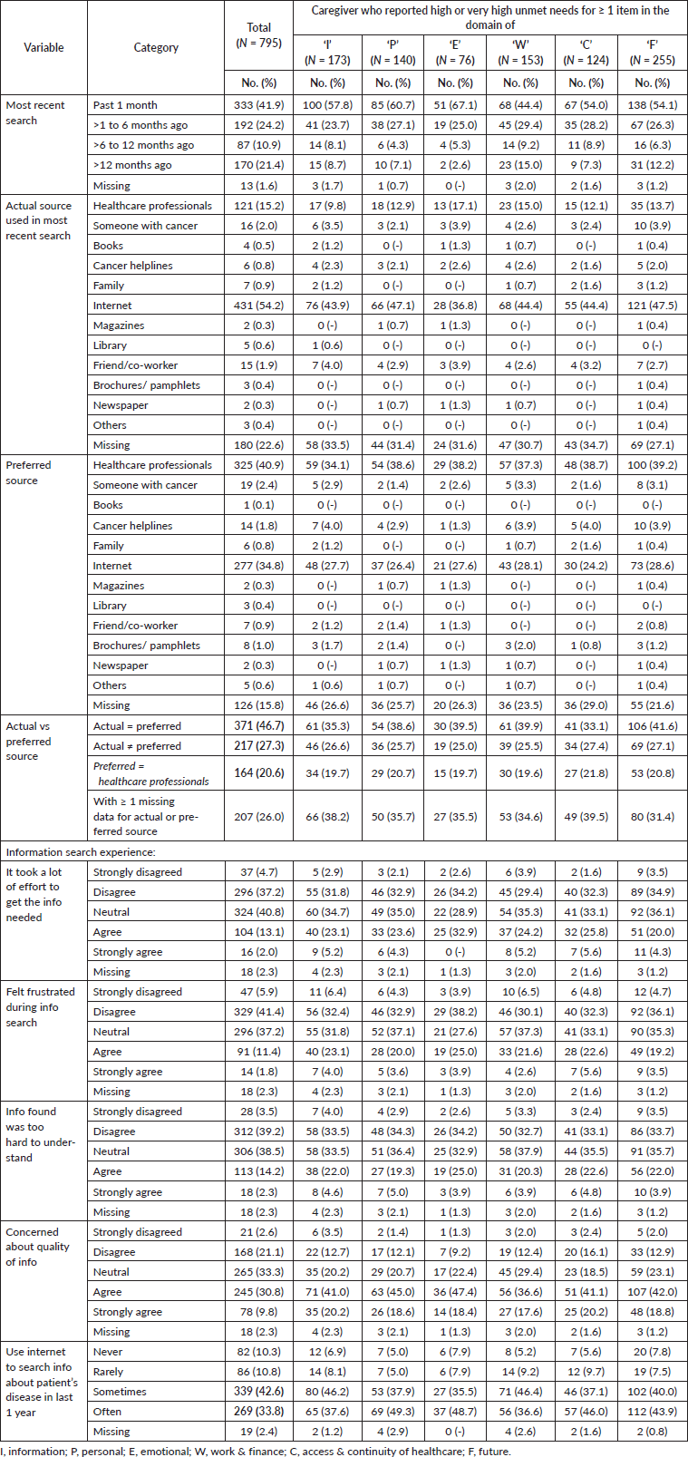 Among the 795 caregivers who have ever searched for cancer information, about half of these caregivers (54%) have searched information on the Internet, and another 15% have obtained their information from HCPs (Figure 1). A total of 371 (47%) caregivers have used their preferred source of information to conduct their most recent information search. Among the 217 (27%) caregivers who did not use their preferred source, a large number (n = 164) of these caregivers’ preferred source was ‘HCPs’. While most caregivers generally had a good experience with their information search—42% disagreed that it took a lot of effort to get the information they needed, 47% disagreed that they were frustrated during the information search and 43% disagreed that the information found were too hard to understand, about 41% agreed that they were concerned about the quality of information they have found.
