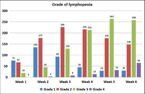 The acute onset of lymphopenia was captured in 532 of these 536 patients. Of 532 patients, 521 patients (97.7%) developed lymphopenia. Grade 1 lymphopenia was noted in 10 (1.9%) patients, grade 2 in 100 (18.8%), grade 3 in 338 (63.5%) and grade 4 in 73 (13.7%) patients. Week-wise incidence and grade of lymphopenia are shown in Figure 1.