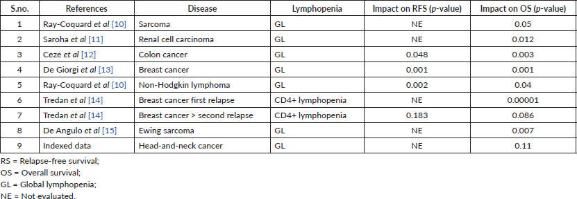 The existence of peripheral immune alterations in cancer patients was shown for the first time in the mid-1970s by Bone and Lauder [9]. Lymphopenia can be functional or treatment induced. Functional lymphopenia has been reported in advanced or metastatic breast cancer, colon cancer and hepatocellular carcinoma [7]. It is associated with dismal outcome. Furthermore, in various malignancies such as carcinoma breast, carcinoma ovary, non-Hodgkin lymphoma, diffuse large B-cell lymphoma, T-cell lymphomas, sarcomas and colon cancer, lymphopenia detected before treatment and early after starting chemotherapy (5–15 days) or radiotherapy is associated with a worse PFS and OS [7]. Its impact on relapse-free survival (RFS) and OS in various malignancies is shown in Table 3 [1015]. In addition, the severity of lymphopenia has been reported as an independent prognostic factor of PFS and OS. According to Manuel et al [16], severe lymphopenia (<200/mm3) in metastatic breast carcinoma has a strong impact on patient survival and also reported 40% and 90% reduction of the median OS or PFS, respectively. Head-and-neck squamous cell carcinoma (HNSCC) is known as an immunogenic tumour showing the presence of infiltrating lymphocytes and other immune cells [17]. The previous studies have suggested the important role of pre-treatment lymphocyte counts with regard to their association with prognosis in HNSCC [7]. However, Campian et al [2] in a retrospective study found no significant difference in PFS and OS between patients with TLC < 500 cells/mm3 and those with TLC ≥ 500 cells/mm3. Similarly, in this study, there was no statistically significant impact of severe lymphopenia on various outcomes (PFS, LRC and OS).