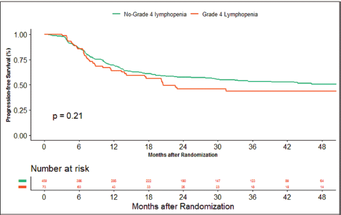Figure 2. Kaplan–Meier curve showing progression-free survival in grade 4 (severe) and non-grade 4 lymphopenia (non-severe).