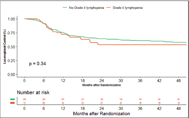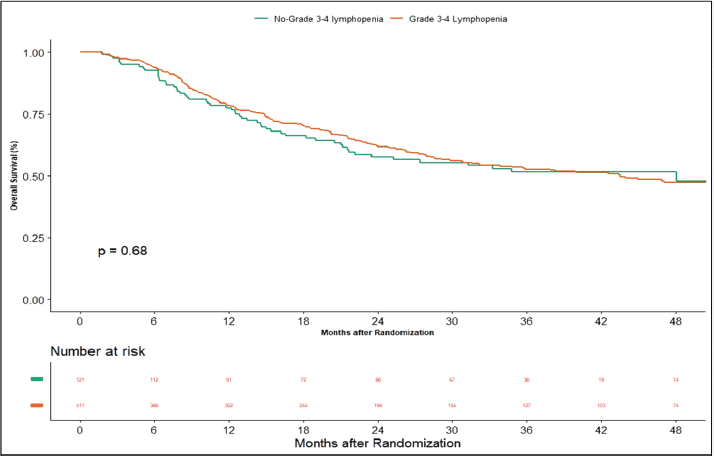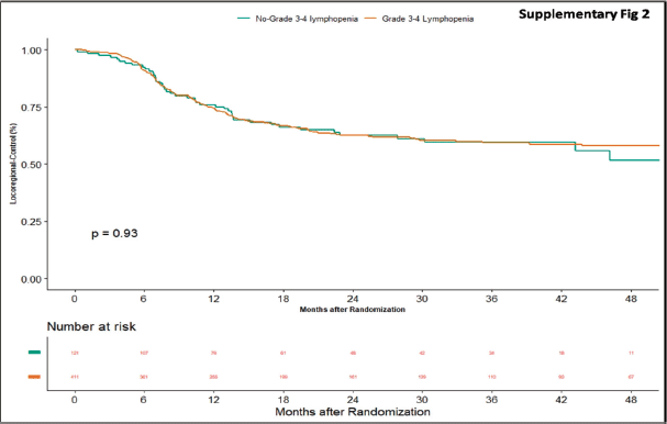 Apart from this, we also did an additional analysis to see any impact of lymphopenia on the outcomes. Here, we compared combined grade 0–2 lymphopenia with combined grade 3–4 lymphopenia. Of 532 patients, 121 patients (22.74%) developed lymphopenia of grade 0–2, whereas grade 3-4 lymphopenia was seen in 411 (77.25%) patients. At the time of censoring, 51 (n = 121) patients with grade 0–2 and 183 (n = 411) patients with grade 3–4 lymphopenia experienced disease progression. The median PFS of grade 0–2 and grade 3–4 lymphopenia was 46.2 (95% CI: 22.4–NA) and 56.3 months (95% CI: 22.9–NA), respectively (p-value = 0.63) (Supplementary Figure 1). Loco-regional failure was observed in 44 patients with grade 0–2 lymphopenia (n = 121), whereas it was seen in 146 (n = 411) patients with grade 3–4 lymphopenia. The median duration of LRC did not reach in both grade 0–2 and grade 3–4 lymphopenias (p-value = 0.93) (Supplementary Figure 2). There were 56 (n = 121) versus 183 (n = 411) deaths, and the median OS was 48.1 (95% CI: 21.7–NA) versus 43.5 (95% CI: 31.6–60.6) months in grade 0–2 and grade 3–4 lymphopenia, respectively (p-value = 0.68) (Supplementary Figure 3).
