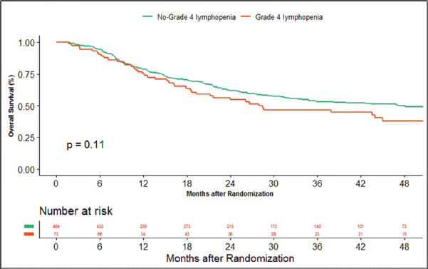 Figure 4. Kaplan–Meier curve showing overall survival in grade 4 (severe) and non-grade 4 lymphopenia (non-severe).