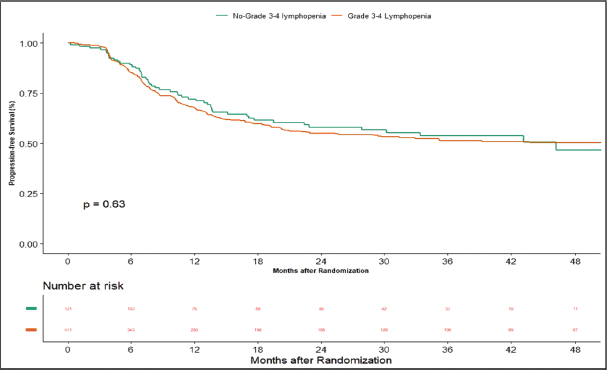 Results: We had a total of 536 patients, of which 521 patients (97.7%) developed lymphopenia. Grade 1 lymphopenia was noted in 10 (1.9%) patients, grade 2 in 100 (18.8%), grade 3 in 338 (63.1%) and grade 4 in 73 (13.7%) patients. The median PFS was 20.53 and 60.33 months in severe and non-severe lymphopenia, respectively (hazard ratio, 0.797; p-value = 0.208). The median duration of LRC was 56.3 months in severe lymphopenia, whereas it was not reached in non-severe lymphopenia (hazard ratio, 0.81; p-value = 0.337). The median OS was 28.46 versus 47.13 months in severe and non-severe lymphopenia, respectively (hazard ratio, 0.76; p-value = 0.11). Of various risk factors, gender was significantly associated with severe lymphopenia.