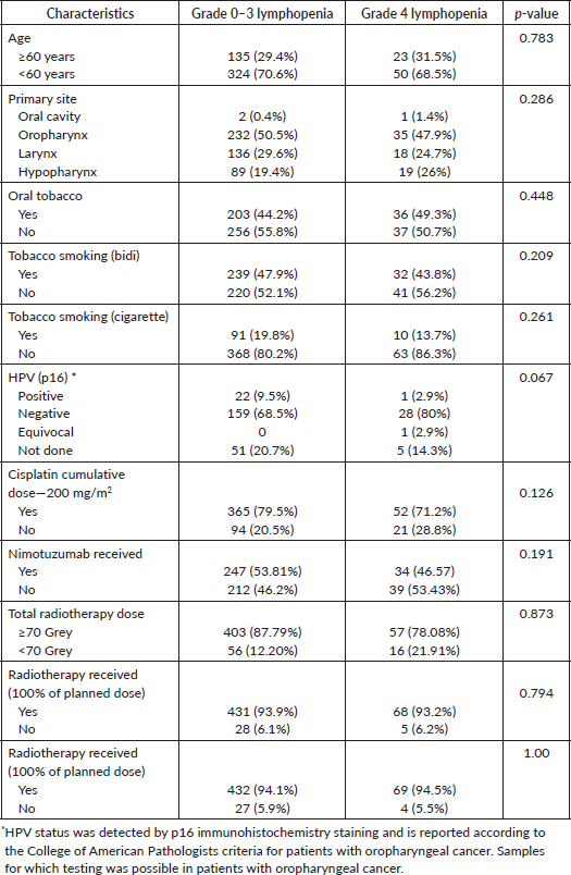 Methods: We recently published a randomised study comparing cisplatin–radiation with nimotuzumab cisplatin–radiation. The database of this study was used for the present analysis. The impact of severe lymphopenia (grade 4 lymphopenia) on progression-free survival (PFS), locoregional control (LRC) and overall survival (OS) was studied using the Kaplan–Meier method and Cox regression analysis. The binary logistic regression analysis was used to see the effect of various factors on the development of severe lymphopenia.