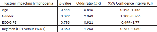 Older age, female gender, accelerated radiotherapy and certain chemotherapy agents (cisplatin, cyclophosphamide, methotrexate and taxanes) have been reported as significant risk factors for the development of lymphopenia [7, 19]. In this analysis, we analysed these factors. Of age, gender, ECOG performance score and chemotherapy regimen (cisplatin versus cisplatin nimotuzumab), gender was the only significantly associated factor with severe lymphopenia.