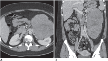 Figure 1. CT Abdomen (1A-Axial section and 1B-Coronal section) showing a 21 × 15 cm mass abutting the left kidney, left renal vessels, distal pancreas and spleen.