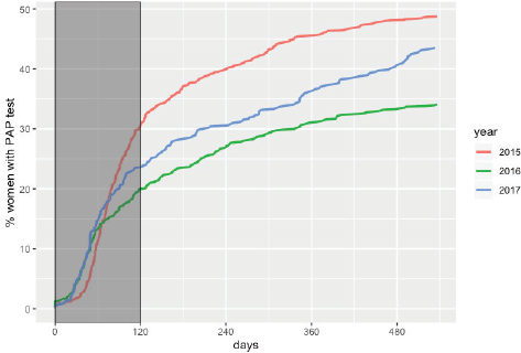 The primary outcomes were: 1) adherence to cytology triage within recommended timeframe – calculated as the percentage of HPV women with cytology triage at 120 days after screening and 2) overall adherence to cytology triage including data at 18 months after screening. Both outcomes were re-corded as dichotomous variables.