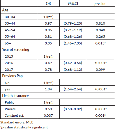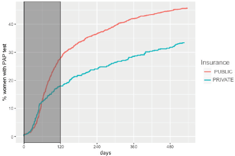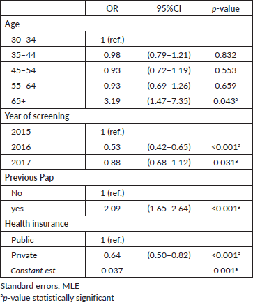 Independent variables considered for this study were: age (30–34, 35–44, 45–54, 55–64,65 ); year of screening test (2015, 2016 and 2017); record of previous Pap-based screening (Yes/No) and health insurance status (public, private).