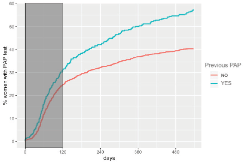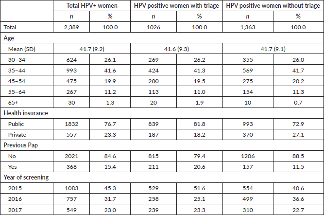 Results: We analysed data of 2,389 HPV women. The overall adherence to triage at 18 months was 42.9%. The percentage of women completing cytology triage within the recommended timeframe of 120 days was lower (25.2%). Women with the record of a previous Pap-based screening had 1.86 times the odds of having a triage compared to women without a record of a previous Pap-based screening (95% CI: 1.64–2.64, p <0.001). Furthermore, the probability of having triage at the recommended timeframe was higher among women who were older and women with public health insurance.