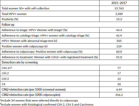 – Positivity: Number of HPV women/total women with self-collected tests.