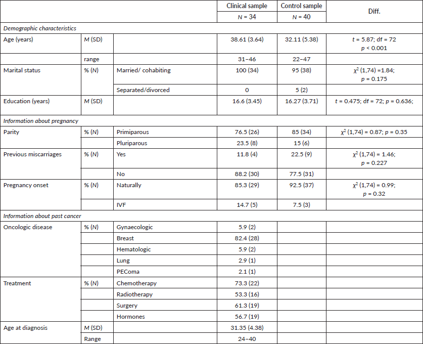 Inferential statistics in socio-demographic characteristics of clinical and control groups are illustrated in Table 1. In our series, the women from the two groups did not differ with regard to years of education, marital status, parity, previous miscarriage, pregnancy onset. However, women from the oncological series were older than controls. Notably, women in the clinical sample received their cancer diagnosis in their 30s and had to complete their oncological treatment before attempting a pregnancy. With reference to diagnosis details in the clinical sample, 82.4% (N = 28) of the women had received a breast cancer diagnosis, 5.9% (N = 2) gynaecological cancer, 5.9% (N = 2) hematologic cancer, 2.9% (N = 1) lung cancer and 2.9% (N = 1) PEComa.