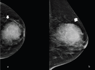 Figure 2. Right side full-field mammography of a 40-year-old patient presenting a unilateral breast mass subsequently identified as a MS. (a): Cranio caudal and (b): mediolateral oblique projection, showing a noncalcified ill-defined radiopaque mass with poorly defined ‘feathery’ margins (arrow).