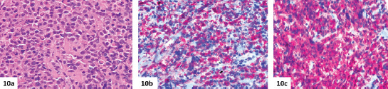 Figure 10. Histologic features of breast MS. (a–c): Breast involvement by MS with inv(16) (p13.1q22) in a 21-year-old female patient. Myeloid blasts are associated with eosinophils (a, haematoxylin-eosin) and express CD34 (b) and myeloperoxidase (c). In this case, the disease involvement was limited to the right breast, and a second needle biopsy was required to assess cytogenetic and molecular features.