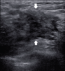 Figure 4. A 60-year-old patient presenting a right unilateral breast mass subsequently identified as a MS. The heterogeneous echo patterns and marked low attenuation are appreciated, with ill-defined margins (arrows).