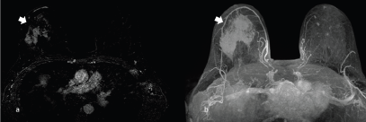 Figure 6. A 63-year-old patient presenting a right unilateral breast mass subsequently identified as a MS. (a) Inhomogeneous enhancement on gadolinium administration (arrow) and (b): the appearance of the mass enhancement (arrow) in the maximum intensity projection.