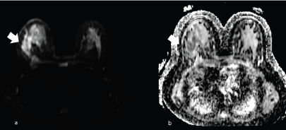 Figure 7. The same patient of Figure 6, showing right unilateral breast mass, subsequently identified as a MS. (a): Diffusion imaging with hyperintense mass (arrow) and (b): the restricted diffusion of the same mass (arrow) in the apparent diffusion coefficient (ADC) mass.