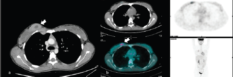 Figure 8. A 50-year-old patient presenting a right unilateral, incidental finding of breast mass subsequently demonstrated to be a MS. (a): Irregular breast mass on the computed tomography exam, showing inhomogeneous contrast enhancement (arrow). (b):The abnormal glucose uptake in PET examination (arrow).