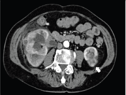Figure 9. Same patient of Figure 8, showing irregular contrast-enhancing soft tissue mass (arrow), resulting in the localisation of MS.