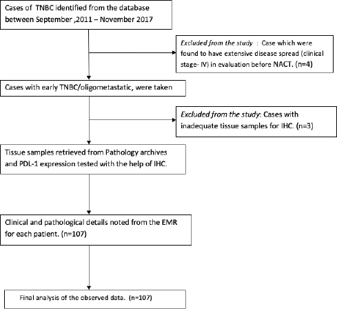 The primary aim of this study was to look at the proportion of non-metastatic TNBCs which express PDL1 in their tumour cells. The secondary aim was to look at the correlation of PDL1 with response (pCR) to NACT and its effect on long-term outcomes, the effect of pCR, neutrophil lymphocyte ratio and platelet lymphocyte ratio on pathological response and outcomes. The endpoints for measuring response are the presence or absence of pCR and for long-term outcomes are RFS and OS.
