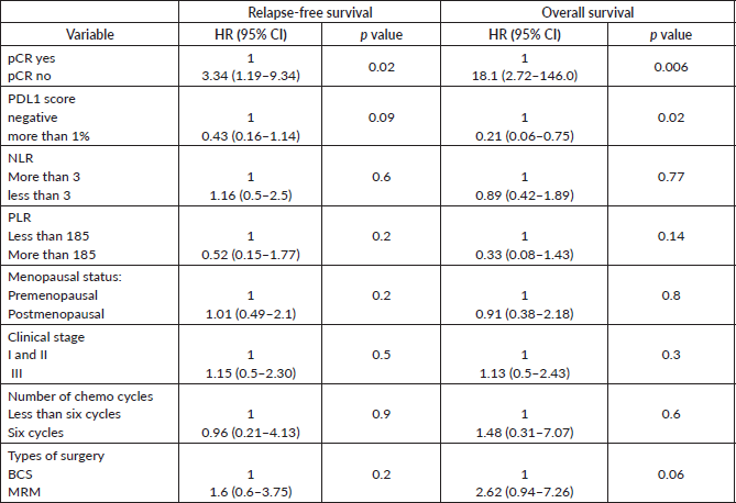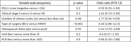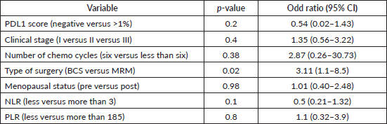 On univariate analysis, only the type of surgery (BCS versus MRM) correlated significantly with pCR (p < 0.001), with a greater number of patients in the BCS group who had pCR, as shown in Table 2. No other factors had a significant correlation with PDL1 expression, clinical stage, menopausal status, number of NACT cycles, NLR or PLR. On multivariate analysis, the statistical significance of the type of surgery (BCS versus MRM) persisted (p = 0.02), favouring BCS (Table 3).