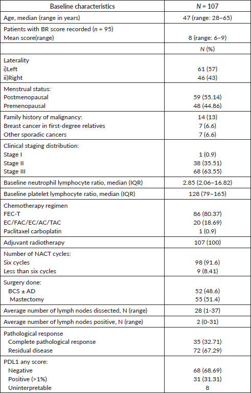A total of 107 patients were enrolled with a median age of 47 years (range: 28–65 years). Baseline clinico-pathologic features are mentioned in Table 1. Postmenopausal were 59 (55.14%) patients. Clinically relevant family history was seen in seven (6.6%) patients. Clinical stage distribution as per AJCC was Stage I = 1 (0.9%), Stage II = 38 (35.51%) and Stage III = 68 (63.55%). The median NLR was 2.85 (interquartile range (IQR): 2.15–4.22) and median PLR was 128 (IQR: 79.84–165.61). All the six cycles of 5-flurouracil, epirubicin, cyclophosphamide and docetaxel (FEC-T) regimen was given to 98 (91.6%) patients. Breast conservation surgery (BCS) was carried out in 52 (48.6%) patients. All patients received adjuvant radiotherapy. The mean number of nodes dissected was 21 (range: 1–37), and the mean number of nodes which were positive were 2 (range: 0–31).