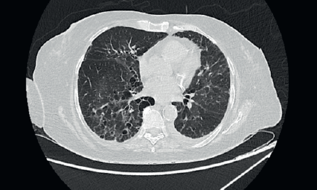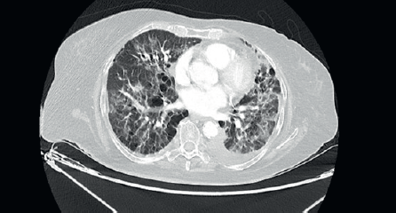 Figure 2. High-resolution CT thorax of the patient, taken at timepoint of clinical deterioration, three months after initiation of CDK 4/6 inhibitor (Palbociclib) therapy.