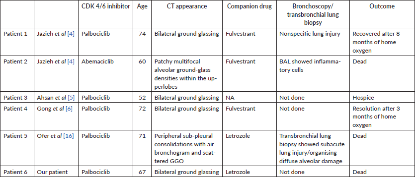 The incidence of pulmonary toxicity (pneumonitis/respiratory failure/embolism) ranges around 1% [714]. There are few prior publications reporting CDK 4/6 inhibitor associated ILD (Table 1). It is a diagnosis of exclusion, in the setting of patients on CDK 4/6 inhibitors presenting with respiratory distress without any infective or auto immune aetiology. All patients were managed with steroids, ventilatory support and supportive measures. The first report of CDK 4/6i related pneumonitis in Asia was from Japan among 14 patients, with the use of Abemaciclib [15].