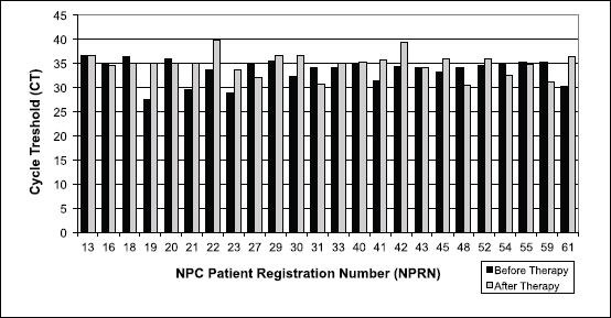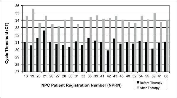 EBV DNA was determined by qPCR cycle threshold (CT) value in 23 serum samples from NPC patients. All samples showed a significant increase in qPCR CT value after therapy as compared to samples taken from the same patient before therapy (Figure 2).