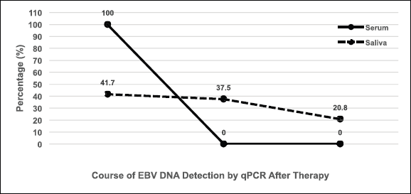 Results: Highly significant (p = 0.0001) increase in cycle threshold qPCR and decrease in the mean concentration of EBV DNA (p = 0.0001) were observed in serum samples, but no significant changes were observed in saliva.