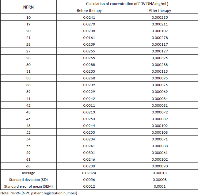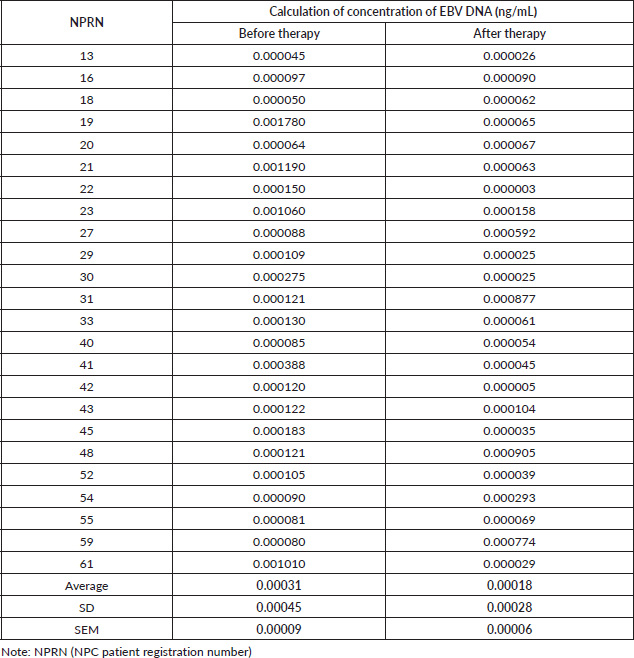 Table 1. The calculation of EBV DNA concentration (EBNA-1) by qPCR in serum of NPC patients before and after undergoing therapy.