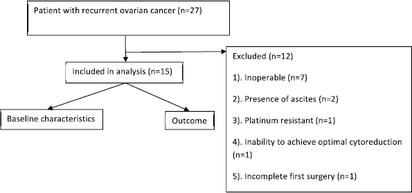 The inclusion criteria were consecutive recurrent PSOC (platinum-free interval > 6 months), age > 18 years, ECOG performance status < 2, absolute neutrophil count > 1,500/mm3, platelets > 1,50,000/mm3, international normalised ratio < 1.5, serum total bilirubin < 1.5 mg/dL, serum alkaline phosphatase < 2.5 times the upper limit of normal, normal renal functions and disease amenable for secondary cytoreduction. The exclusion criteria were patients with bowel obstruction, absence of peritoneal disease and non-epithelial/borderline ovarian cancer.