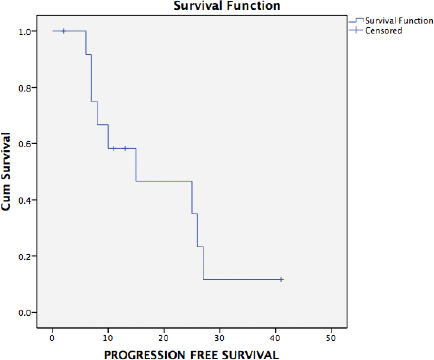 Figure 2. Kaplan–Meier analysis showing PFS of 13 patients with platinum sensitive recurrent ovarian cancer who underwent secondary cytoreduction with HIPEC. The median PFS was 15 months (range: 1–34 months).