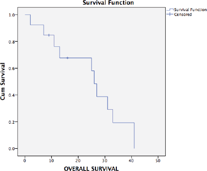 Figure 3. Kaplan–Meier analysis showing OS of 13 patients with platinum sensitive recurrent ovarian cancer who underwent secondary cytoreduction with HIPEC. The median OS was 26 months (range: 22.9–29.0).