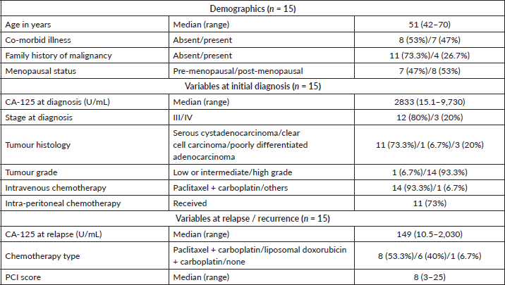 Twenty-seven patients (Figure 1) underwent screening among whom twelve were excluded from the trial. The reasons for exclusion were incomplete first surgery (n = 1), inoperable disease (n = 7), presence of ascites (n = 2), platinum-resistant disease (n = 1) and inability to achieve optimal cytoreduction (n = 1). Fifteen patients were included in this trial with a median follow-up of 25 months (Table 1). The median age was 51 years (range: 42–70 years). Co-morbid illness was present in 53% (8/15), the most common being diabetes (40%) followed by hypertension (13%). A family history of cancer was present in 26% (4/15), and the most common malignancy was breast cancer (13%). About 53% were postmenopausal and the rest were premenopausal, all women were ECOG performance status 1.