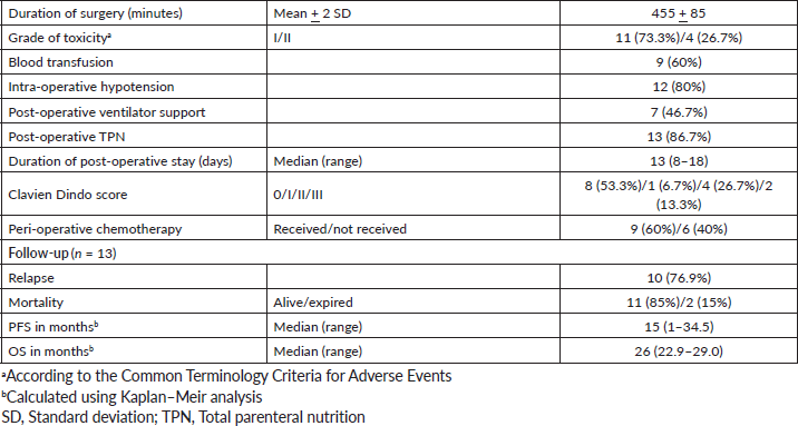 The mean CA 125 at the time of recurrence was 149 U/mL (range: 10–2,030 U/mL) and the median platinum-free interval was 21 months. The perioperative chemotherapy used was paclitaxel + carboplatin 53.3% (8/15), liposomal doxorubicin + carboplatin 40% (6/15) and none 6.5% (1/15). The median PCI score before secondary cytoreduction was 8 (range: 3–25). The mean duration of surgery (secondary cytoreduction and HIPEC) was 455 + 85 minutes (Table 2). Following surgery, blood component support was required in 60% (9/15), total parenteral nutrition (TPN) in 87% (13/15), inotropes in 80% (12/15) and mechanical ventilation in 47% (7/12) patients. The median time to ambulation was the 4th postoperative day. The median duration of hospital stay was 13 days (range: 8–18). The nadir white blood cell count was 3,500 cells/mm3 and none of them had nephrotoxicity. The Clavien Dindo score was I, II and III in 6.7%, 26.7% and 13.3% patients, respectively.