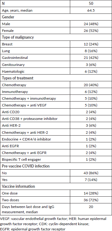 Fifty patients were recruited with a median age of 64.5 years, 48% were males and 52% were females. Seven patients (14%) had COVID-19 infection prior to vaccination. 12% (n = 6) of the patients had a haematological malignancy and the rest had a solid organ tumour, with the following distribution: gastrointestinal 42%, breast 24%, lung 16% and genitourinary 6% (Table 1). All patients have received at least one dose of the BNT162b2 mRNA vaccine except one patient who received ChAdOx1 (two doses), one patient who received Gam-COVID-Vac (two doses) and one patient who received both BBIBP-CorV and BNT162b2 vaccines. Six patients (12%) had negative IgG titers after receiving two doses of vaccine.