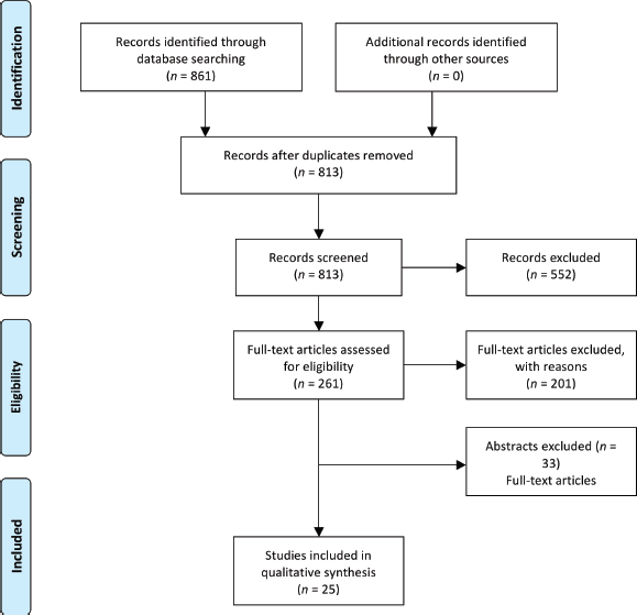 After removal of duplicates, the initial search yielded 806 articles. Of these, 544 did not describe a specific medical education intervention. The remaining 261 full text articles were assessed for eligibility, and 201 did not meet the eligibility criteria. Sixty articles met our inclusion criteria, of which 33 were only in abstract form. Two articles were not available in full-text format. Twenty-five full-text articles were included in this scoping review (Figure 1). Of the 25 articles included, nine were quantitative studies [17–25], eleven were qualitative studies [27–36] and five were mixed method studies [37–41]. An overview of the selected articles is available in Table 1. Full details are available in Supplementary Tables 1 and 2.